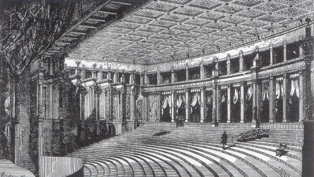 Im Gegensatz zum traditionellen italienischen, Hufeisenförmigen und flachen Logentheater, ist der Zuschauerraum zudem ein ansteigendes Auditorium nach Vorbild der antiken Amphitheatern, der eine gute Sicht von allen Plätzen aus ermöglicht. Kinosäle haben im 20. Jahrhundert diese “demokratische” Sitzordnung größtenteils übernommen.